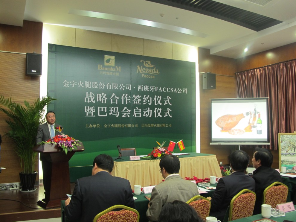 西班牙FACCSA公司负责人拉蒙先生在致辞中表示,发酵火腿在中国有巨大的市场空间,巴玛火腿是中国发酵火腿的领军品牌。双方建立战略合作关系,是企业发展需要,也是优势互补的最佳选择。今后,双方要整合资源,加强交流,深化合作,努力把两个企业的合作打造成中西两国经贸合作的典范。