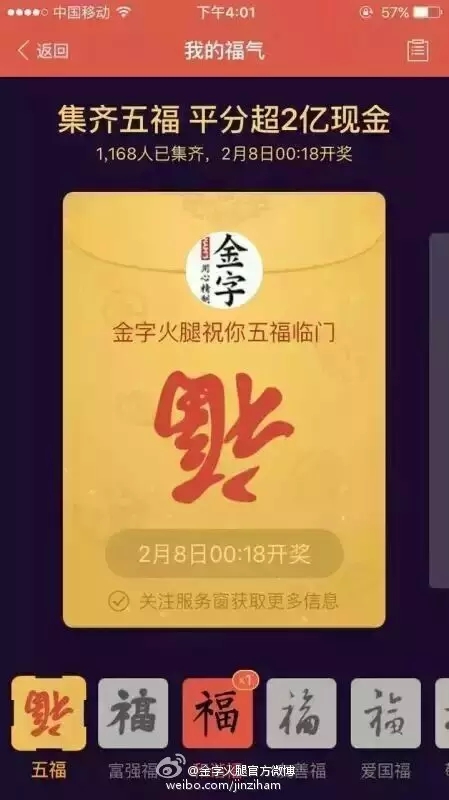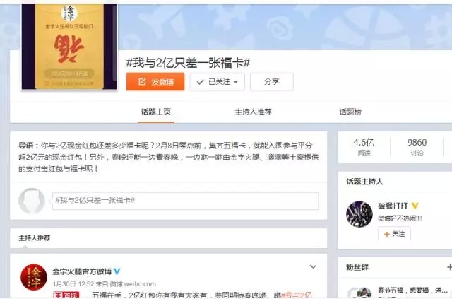 自前几天支付宝将“集5福,抢2亿+红包”的活动规则公布后,一时间,有关福卡换赠的话题强行霸屏。在有非凡娱乐 粉丝集齐了五福后,非凡娱乐 顺势在微博平台上策划的#我与2亿只差一张福卡#的微话题就引发了高达4.6亿的阅读量,网友们通过点赞评论及转发分享的方式,第一时间表达了自己对于五福福卡和春晚2亿红包的高度期待!
